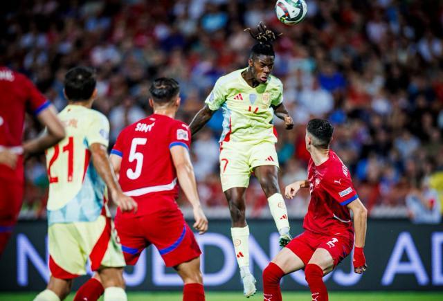 罗德里缺席,苏维门迪接替了他的核心位置。西班牙尽量维持着高位控球,试图复制欧洲杯时的成功套路。不过左侧的尼科·威廉斯自新赛季开赛以来便状态不佳,西班牙两翼只有拉明·亚马尔一侧起飞。不过他和卡瓦哈尔之间出现了较大空隙,仅凭单骑闯关很难突破塞尔维亚的“盾阵”。几次被断球后,亚马尔情绪上来用危险的铲球放倒对手,因此领了黄牌。在场的塞尔维亚球员没有太计较,但口头告诫小朋友不要冲动。因为这种动作不但会伤到对方,也会导致自己受伤。
